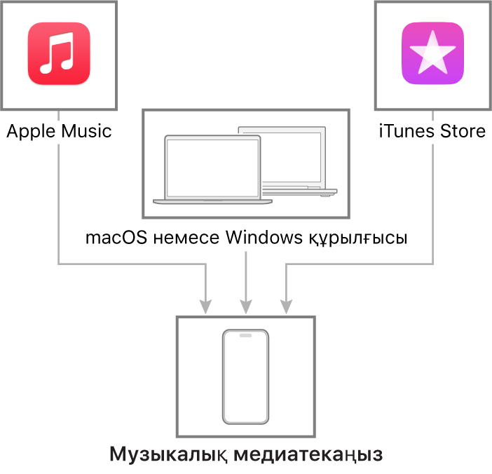 iPhone мен құрылғыңыздың арасында музыканы тасымалдап, жаңарту үшін Mac компьютеріңізді немесе Windows құрылғыңызды жалғаңыз. Қолдау көрсетілетін контентті синхрондау үшін «Музыка» (macOS 10.15 немесе одан кейінгі нұсқасы) немесе iTunes (macOS 10.14 немесе оған дейінгі нұсқасы және Windows құрылғылары) қызметтерін пайдаланыңыз.