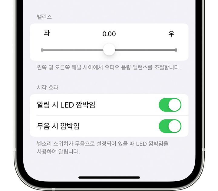 iPhone 또는 iPad*가 무음 모드일 때 LED가 깜빡이지 않게 하려면 '무음 시 깜빡임'을 끕니다.