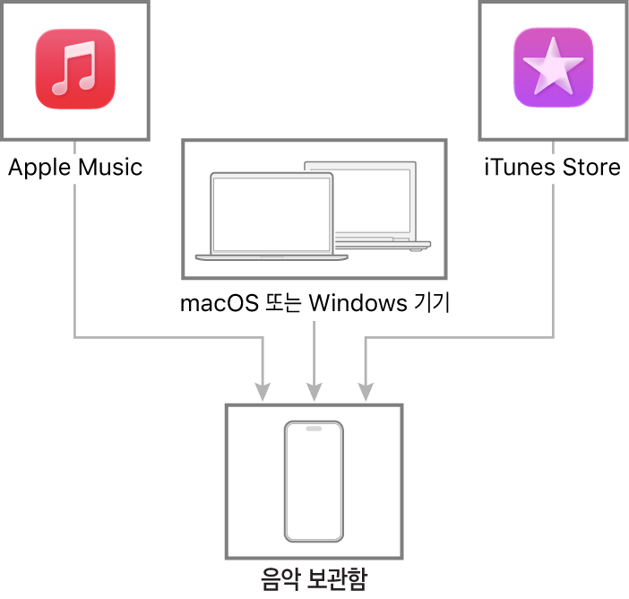 Mac 또는 Windows 기기를 연결하여 iPhone 및 기기 간에 음악을 전송하고 업데이트할 수 있습니다. 지원되는 콘텐츠를 동기화하려면 음악 앱(macOS 10.15 이상)이나 iTunes(macOS 10.14 또는 이전 버전 및 Windows 기기)를 사용하십시오.