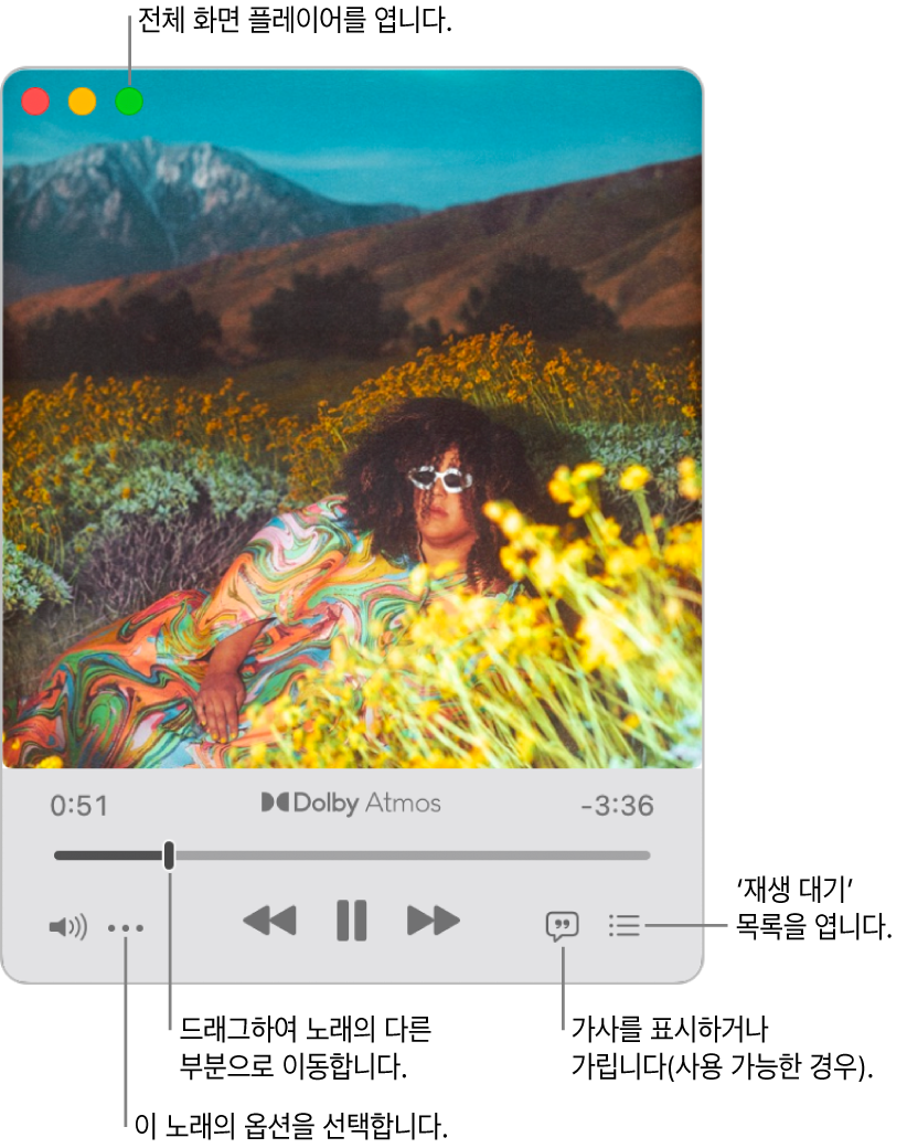 팁: 재생 제어기에서 미니 플레이어 또는 전체 화면 플레이어를 빠르게 열려면 앨범 표지를 클릭한 다음, 옵션을 선택하십시오.