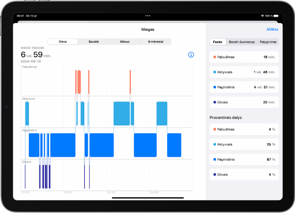 Miego istorijos peržiūra „iPad“ programoje „Sveikata“
