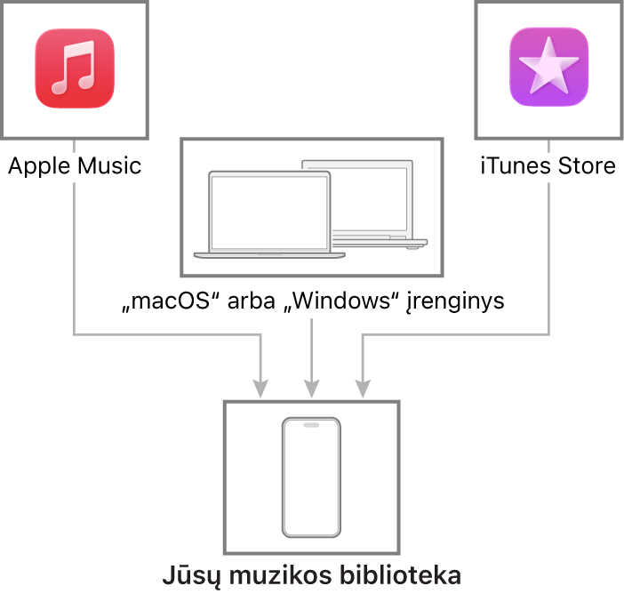 Prijunkite savo „Mac“ ar „Windows“ įrenginį, kad perkeltumėte muziką iš „iPhone“ į savo įrenginį ir atvirkščiai ir atnaujintumėte. Norėdami sinchronizuoti palaikomą turinį naudokite „Muzika“ („macOS 10.15“ arba naujesnėse versijose) arba „iTunes“ („macOS 10.14“ arba ankstesnėse versijose bei „Windows“ kompiuteriuose).