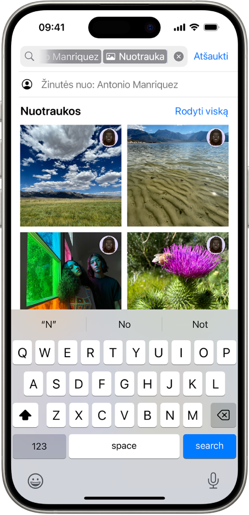 Paieškos laukelyje taip pat pateikiami pasiūlymai, pvz., pokalbių, nuotraukų, vietovių, nuorodų ir kt. Bakstelėkite bet kurį pasiūlymą, kad greitai pereitumėte prie pokalbio.