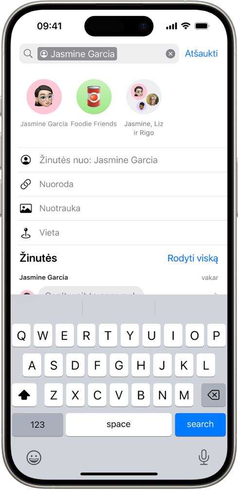 Apribokite paiešką iki vieno asmens arba pokalbio: pradėkite rašyti asmens vardą, bakstelėkite „Žinutės su“ arba „Žinutės pokalbiuose apie (su)“, tada bakstelėkite kitus rodomus kriterijus arba įtraukite bet kokį tekstą, kurį norite rasti pokalbyje.