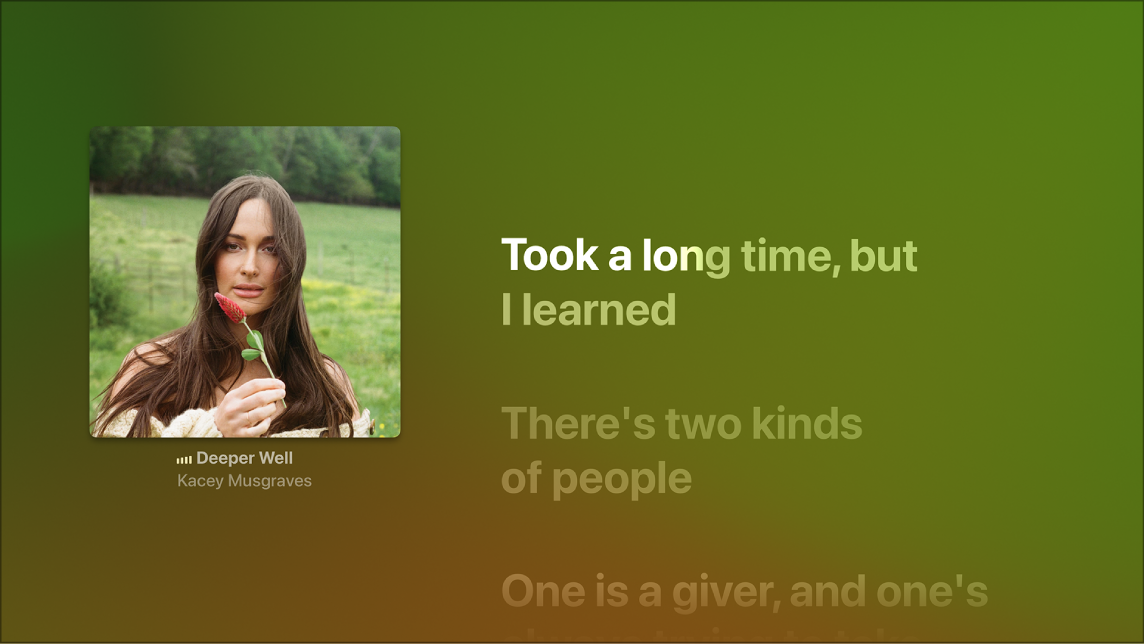 Pastaba. Tarimo ir vertimo parinktys rodomos tik tada, kai daina atitinka jūsų pasirinktus „Apple TV 4K“ kalbos nustatymus. Žr. Keiskite „Apple TV 4K“ kalbą arba regioną.