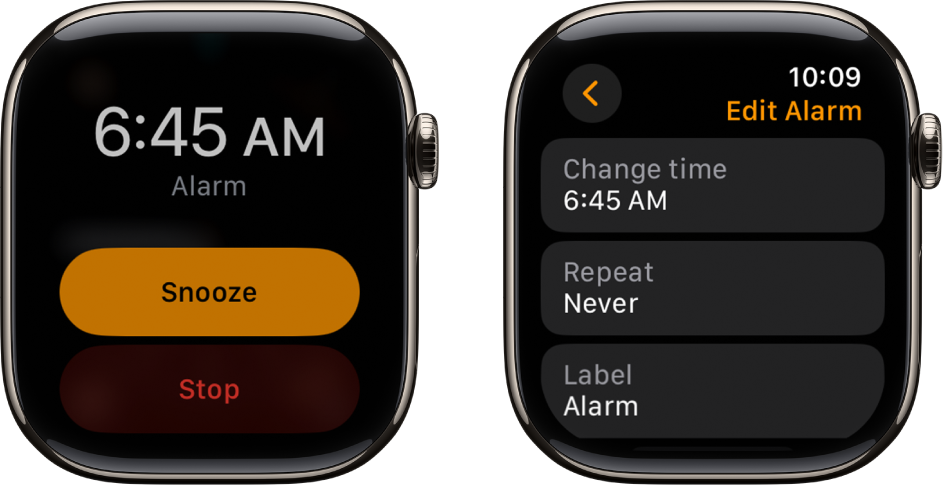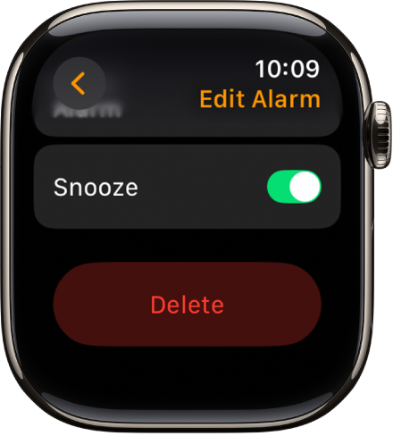 Girdėdami žadintuvo garsus paspauskite šoninį mygtuką, kad juos išjungtumėte, arba paspauskite „Digital Crown“, jei norite nusnūsti.