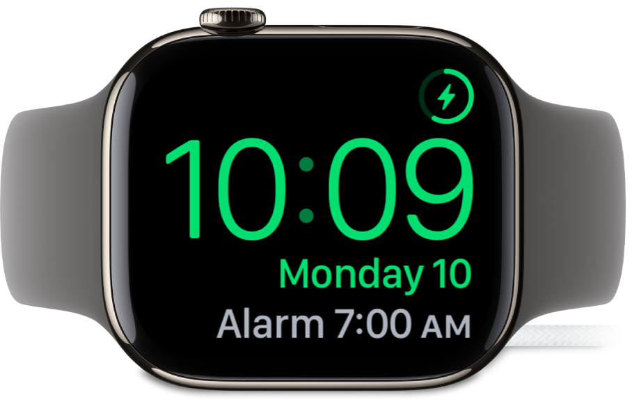 Kai naktinio staliuko režimu veikiantį „Apple Watch“ prijungiate prie įkroviklio, jis rodys įkrovimo būseną, esamus datą ir laiką nustatytų žadintuvų laiką. Norėdami peržiūrėti laiką palieskite ekraną arba nestipriai bakstelėkite „Apple Watch“. Gali užtekti bakstelėti arba paliesti stalą.