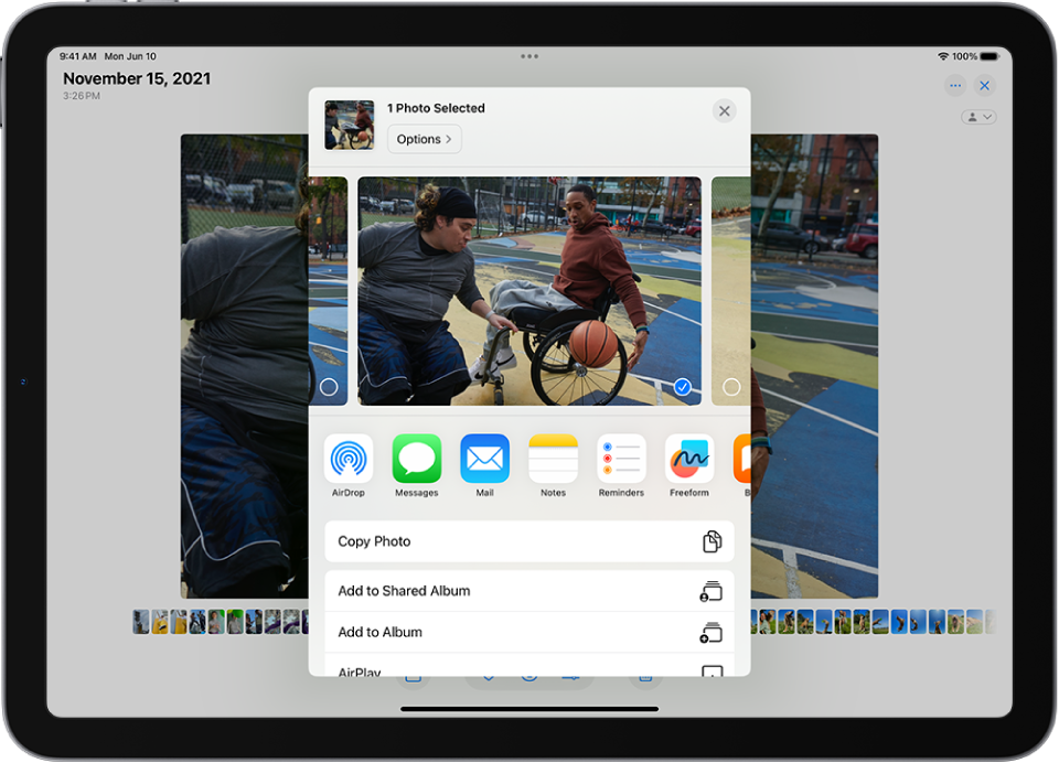 Varat koplietot fotoattēlus un videoklipus lietotnēs Mail vai Messages vai citām jūsu instalētām lietotnēm. Varat arī izmantot AirDrop, lai nekavējoties kopīgotu fotoattēlus ar jebkuru tuvumā esošu personu iPhone, iPad, Mac vai Apple Vision Pro ierīcē.