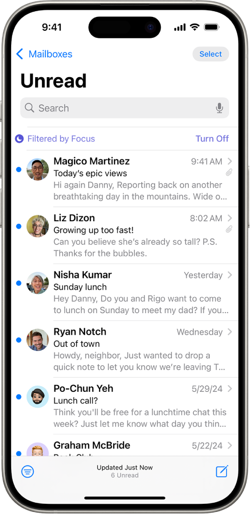 ഒരു പ്രത്യേക ‘ഫോക്കസ്’ ഓണായിരിക്കുമ്പോൾ, നിങ്ങൾക്ക് Mail-ൽ ഏതെല്ലാം ഇ-മെയിൽ അക്കൗണ്ടുകൾ ആണ് ദൃശ്യമാകുന്നത് എന്ന് വ്യക്തമാക്കാനും കഴിയും.