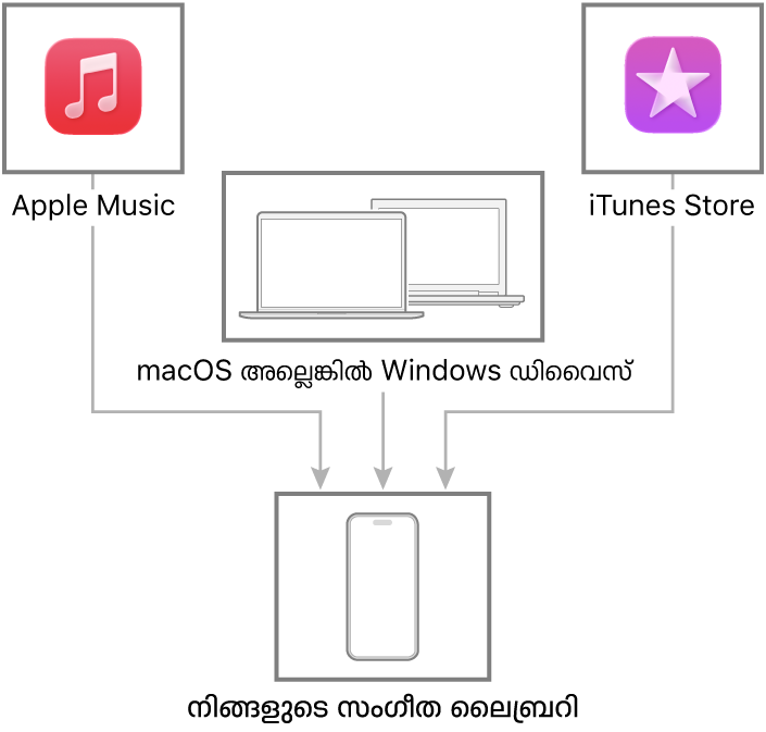 നിങ്ങളുടെ iPhone-നും ഡിവൈസിനും ഇടയിൽ സംഗീതം കൈമാറ്റം ചെയ്യാനും അപ്ഡേറ്റ് ചെയ്യാനും നിങ്ങളുടെ Mac അല്ലെങ്കിൽ Windows ഡിവൈസ് കണക്റ്റ് ചെയ്യൂ. പിന്തുണയ്ക്കുന്ന ഉള്ളടക്കം സിങ്ക് ചെയ്യാൻ, സംഗീതം ( macOS 10.15 അല്ലെങ്കിൽ അതിനുശേഷമുള്ളത്) അല്ലെങ്കിൽ iTunes ( macOS 10.14 അല്ലെങ്കിൽ അതിനുമുൻപുള്ളതും Windows ഡിവൈസുകളും) ഉപയോഗിക്കൂ.
