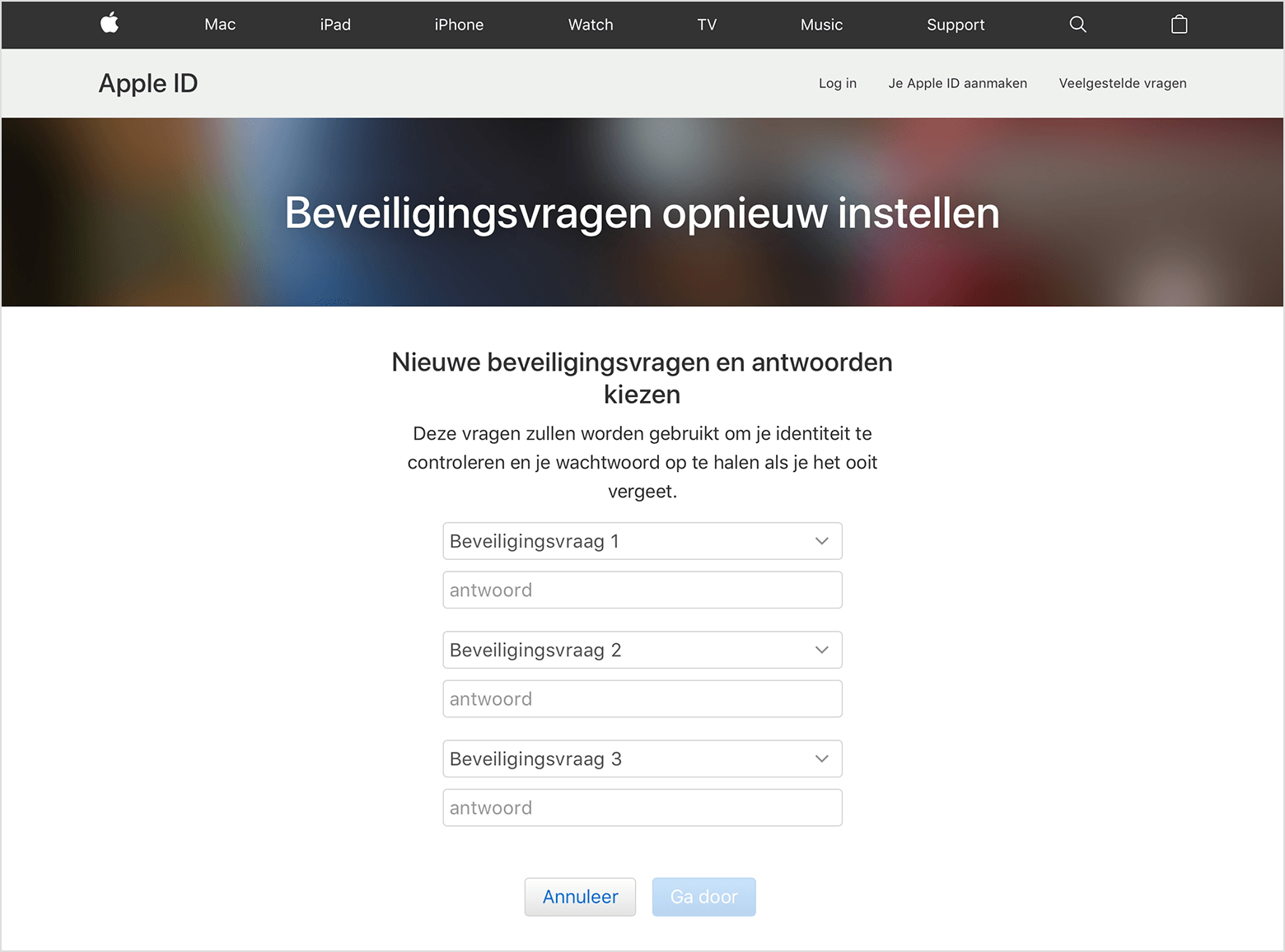 Apple neemt de beveiliging van uw gegevens heel serieus. Daarom maken wij gebruik van beveiligingsvragen om te kunnen waarborgen dat alleen u wijzigingen kunt aanbrengen in uw account. Als u uw antwoorden bent vergeten, volgt u deze stappen om uw identiteit te verifiëren en stelt u vervolgens uw beveiligingsvragen opnieuw in.