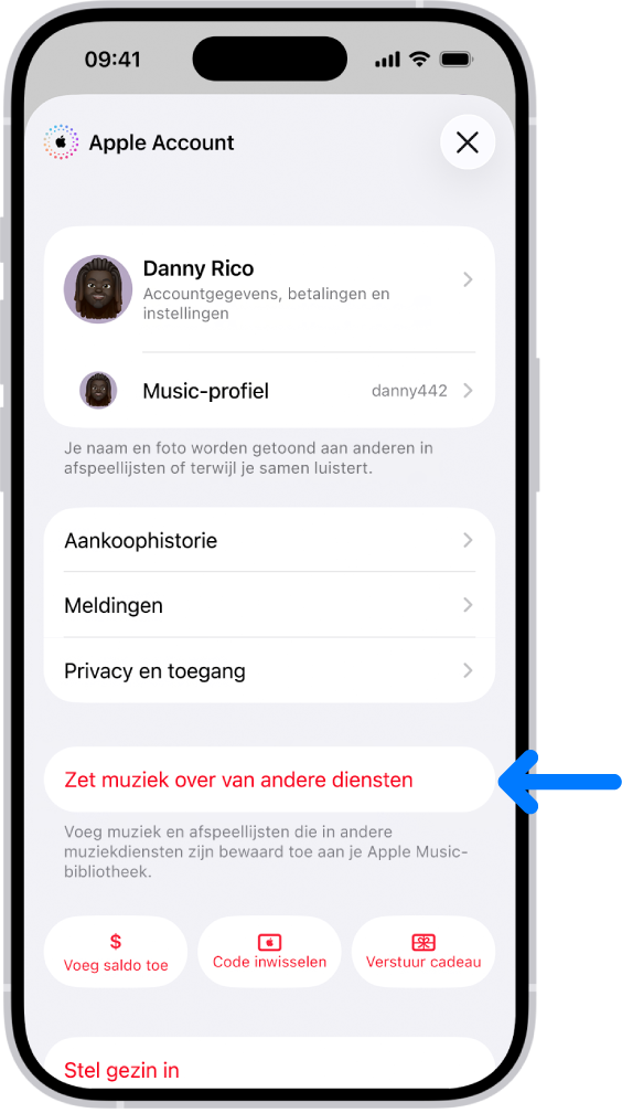 Met een abonnement kun je je muziek eenvoudig van andere muziekdiensten overzetten naar Apple Music. Tik op je profielafbeelding rechtsbovenin en tik op 'Zet muziek van andere diensten over'. Volg de instructies op het scherm om je bestaande bibliotheek of afspeellijsten over te zetten.