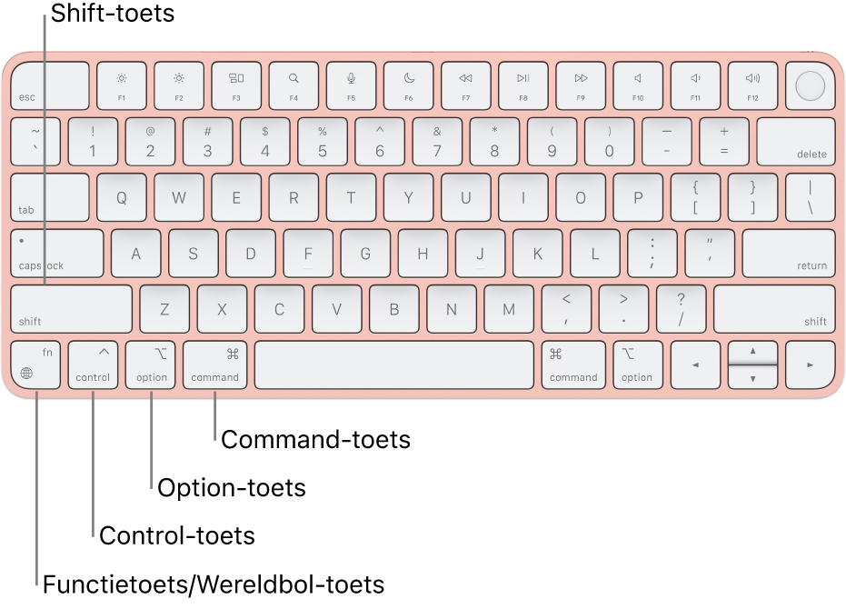 Opmerking: Op een Magic Keyboard van Apple met Touch ID en numeriek toetsenblok zit de functietoets/Wereldbol-toets rechts naast de Delete-toets.