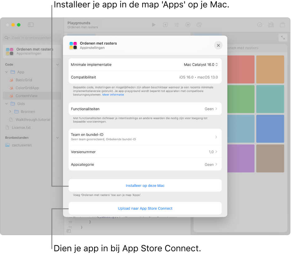 Je kunt een app die je hebt aangemaakt in de map 'Apps' op je Mac installeren. Als je een Apple Developer-account hebt, kun je de app indienen bij App Store Connect.