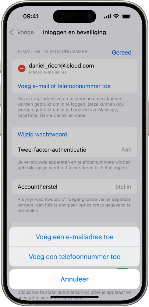 naar '[je naam]' > 'Inloggen en beveiliging' en tik je op 'Voeg e‑mailadres of telefoonnummer toe'. Tik op 'Telefoonnummer', voer je nieuwe telefoonnummer in en volg de instructies op het scherm om je nieuwe nummer te verifiëren.