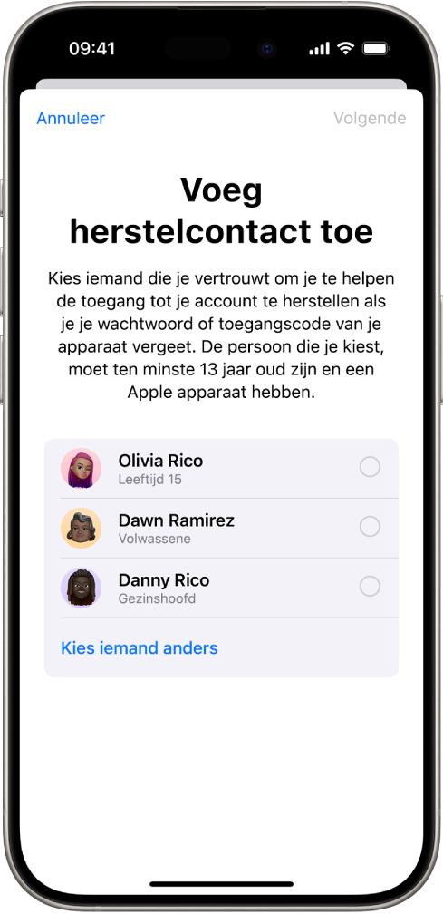 op '[je naam]' > 'Inloggen en beveiliging' > 'Herstelcontacten' en tik op een voorgestelde contactpersoon of op 'Kies iemand anders'.