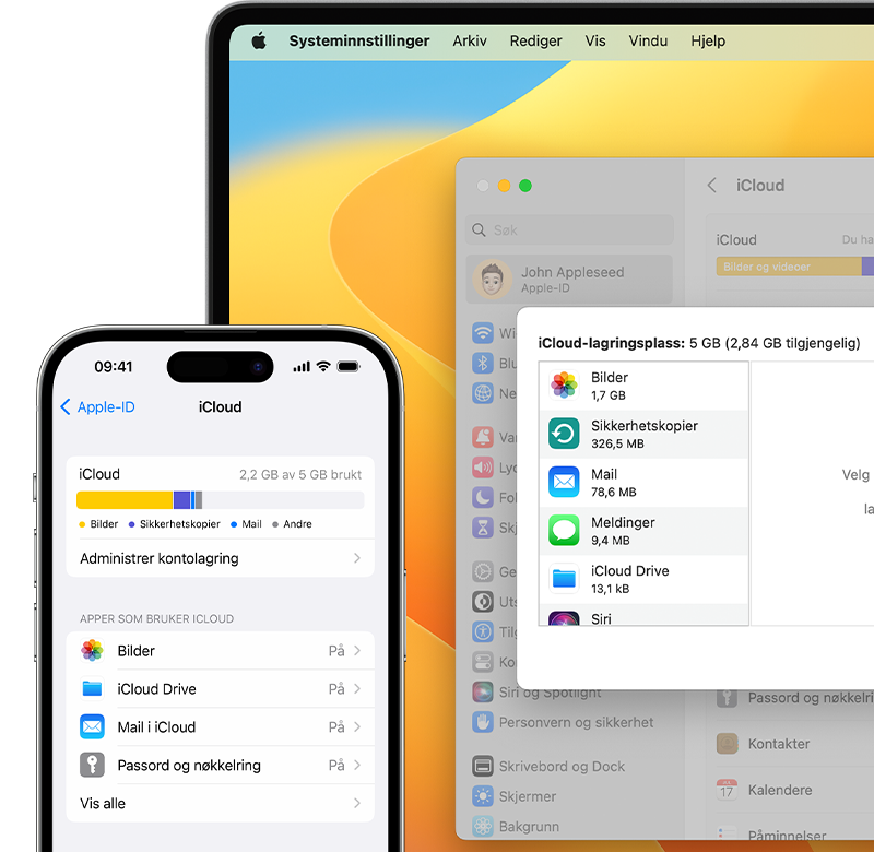 * For å sjekke iCloud-lagringen din på Mac, velger du Apple-menyen > Systeminnstillinger. Klikk på Apple-ID og deretter iCloud.