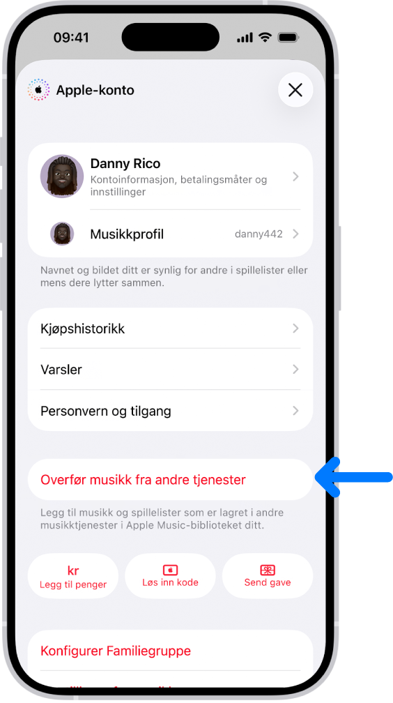 Når du abonnerer, kan du enkelt overføre musikken din fra andre musikktjenester til Apple Music. Trykk på profilsymbolet ditt øverst til høyre, og trykk deretter på Overfør musikk fra andre tjenester. Følg instruksjonene på skjermen for å overføre eksisterende bibliotek eller spillelister.