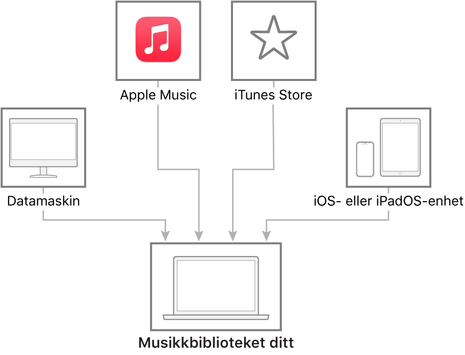 Hvis du ikke abonnerer på Apple Music og du vil legge til favorittsangene og -albumene dine, kan du kjøpe og laste ned musikk fra iTunes Store. Og hvis du har kjøpt objekter fra iTunes Store tidligere kan du laste dem ned til autoriserte datamaskiner og enheter (opptil ti totalt).