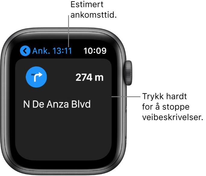, skru på Digital Crown for å bla gjennom foreslåtte ruter, trykk på en rute for å se sving-for-sving-veibeskrivelse, og gjør deretter ett av følgende:Merk: Stedstjenester må være slått på for å bruke sving-for-sving-veibeskrivelser. Gå til Innstillinger