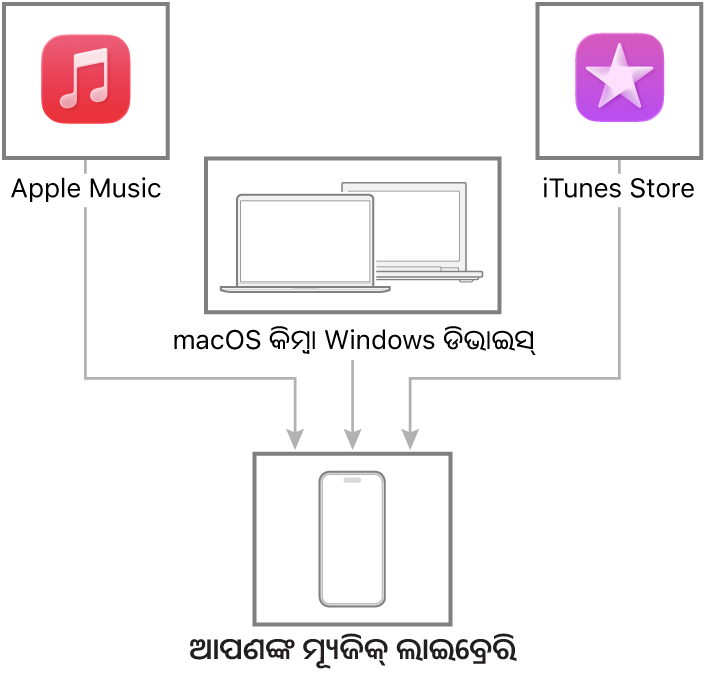 ଆପଣଙ୍କ iPhone ଏବଂ ଆପଣଙ୍କ ଡିଭାଇସ୍ ମଧ୍ଯରେ ମ୍ଯୁଜିକ୍ ଟ୍ରାନ୍ସ୍ଫର୍ ଏବଂ ଅପ୍ଡେଟ୍ କରିବା ପାଇଁ ଆପଣଙ୍କ Mac କିମ୍ବା Windows ଡିଭାଇସ୍ ସଂଯୋଗ କରନ୍ତୁ। ସମର୍ଥିତ ବିଷୟବସ୍ତୁ ସିଙ୍କ୍ କରିବାକୁ, ମ୍ଯୂଜିକ୍ (macOS 10.15 କିମ୍ବା ପରବର୍ତ୍ତୀ ଭର୍ଶନ୍) କିମ୍ବା iTunes (macOS 10.14 କିମ୍ବା ପୂର୍ବବର୍ତ୍ତୀ ଭର୍ଶନ୍ ଏବଂ Windows ଡିଭାଇସ୍) ବ୍ଯବହାର କରନ୍ତୁ।