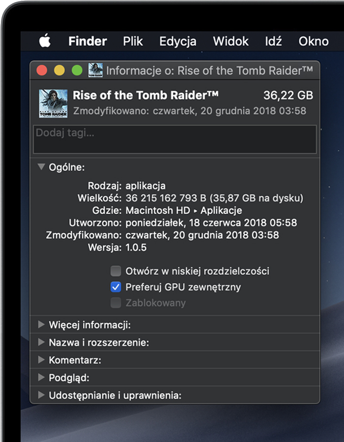 Począwszy od systemu macOS Mojave 10.14, funkcję Preferuj GPU zewnętrzny można włączyć w panelu Informacje wybranej aplikacji w Finderze. Ta opcja umożliwia urządzeniom Blackmagic eGPU i Blackmagic eGPU Pro przyspieszanie aplikacji na wyświetlaczu podłączonym do komputera Mac, w tym na wyświetlaczach wbudowanych w komputery Mac: