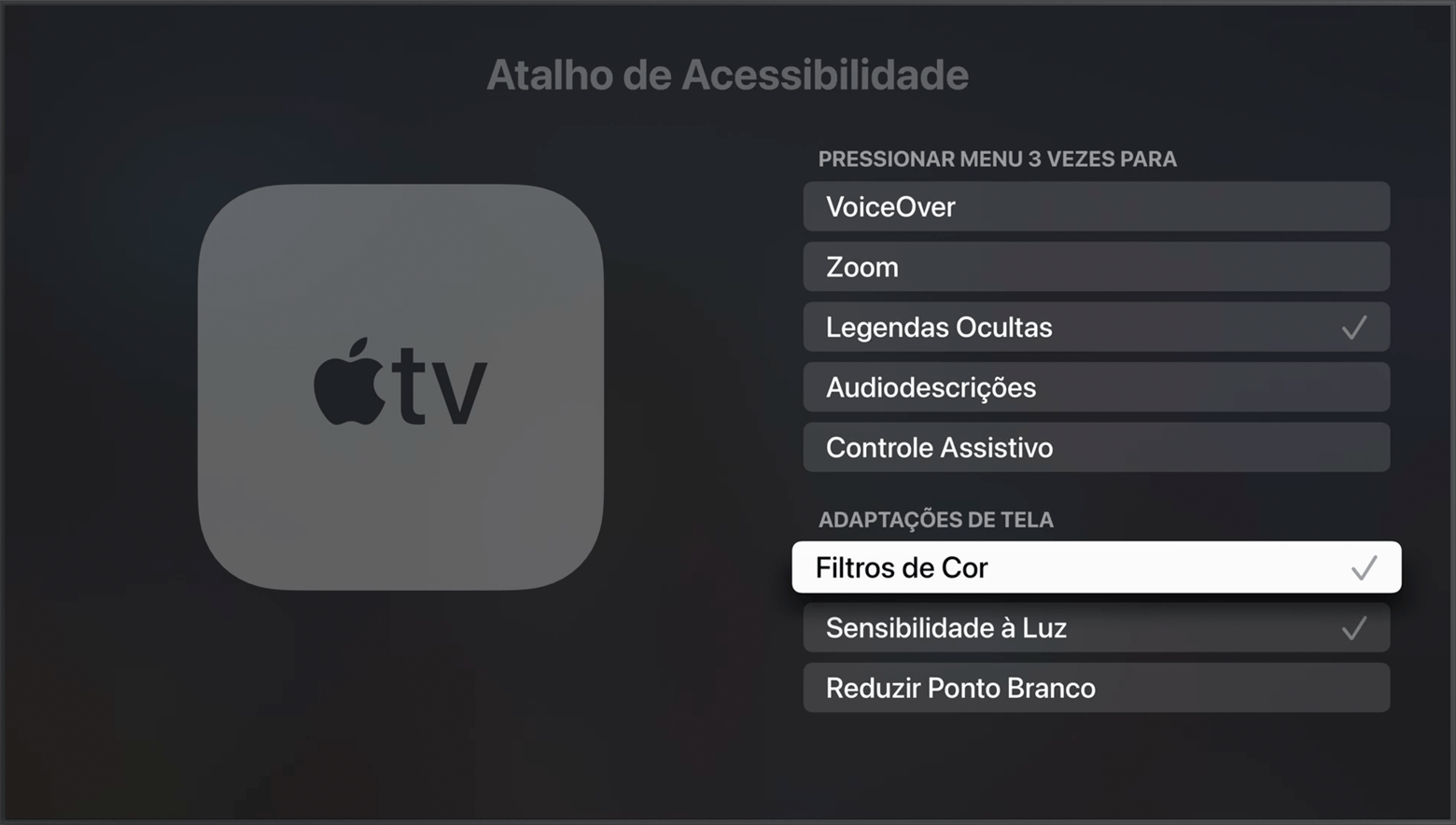 Saiba como usar auxílios visuais na Apple TV 4K ou Apple TV HD, como Filtros de Cor, Reduzir Ponto Branco e muito mais.