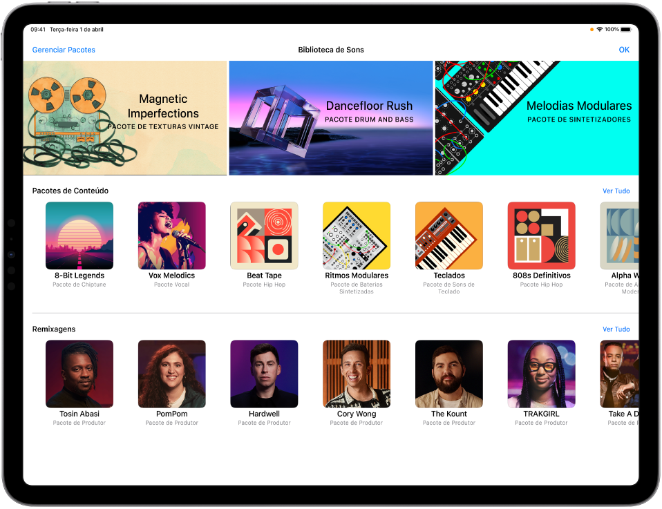 Use a Biblioteca de Sons para baixar e gerenciar pacotes de som que contêm centenas de loops, sons, Instrumentos Touch, baterias e mais. O GarageBand informa você quando há novos pacotes de som disponíveis para baixar.