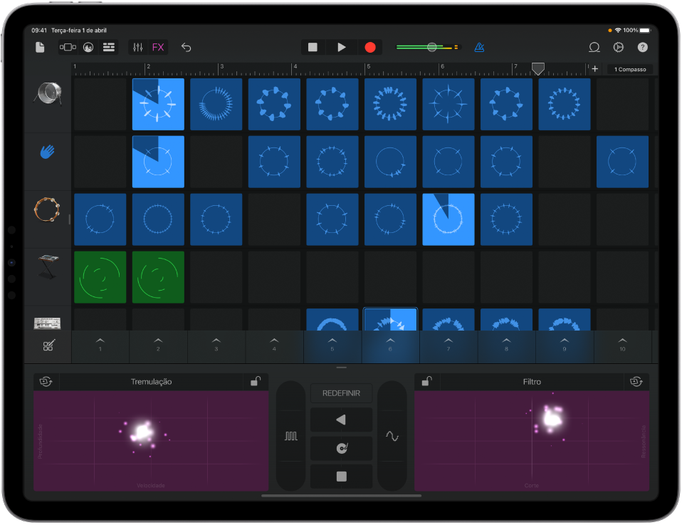 Use Live Loops para criar música eletrônica. Basta tocar nas células e colunas na grade para acionar loops musicais. É possível criar seus próprios arranjos e, em seguida, improvisar e gravar uma performance de Live Loops.