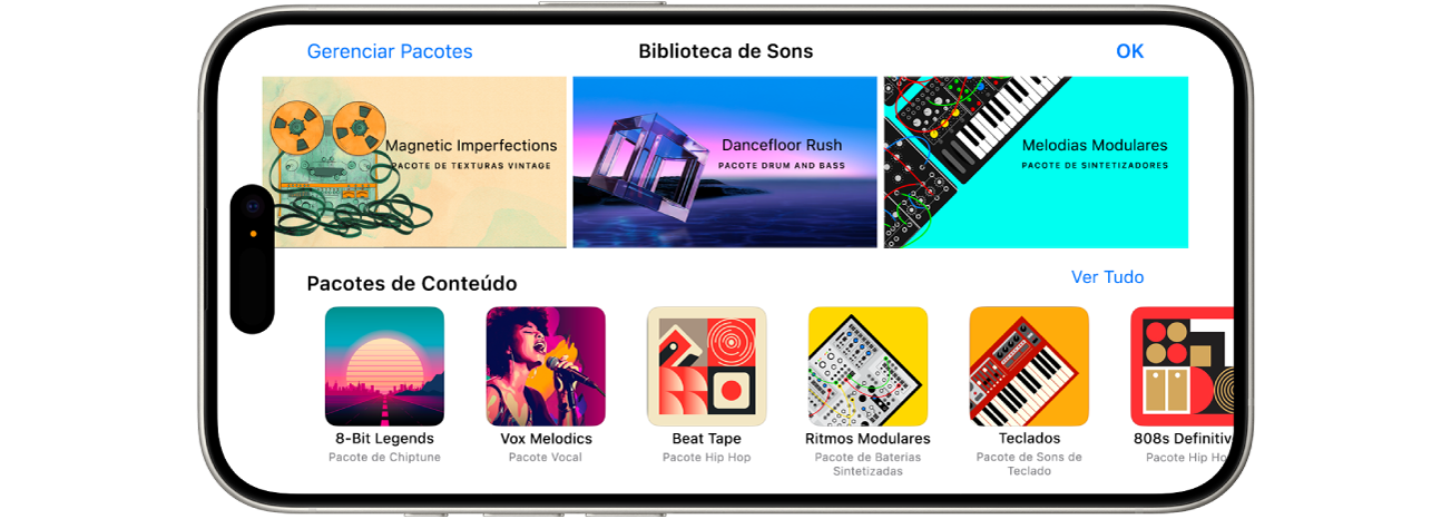 Use a Biblioteca de Sons para baixar e gerenciar pacotes de som que contêm centenas de loops, sons, Instrumentos Touch, baterias e mais. O GarageBand informa você quando há novos pacotes de som disponíveis para baixar.