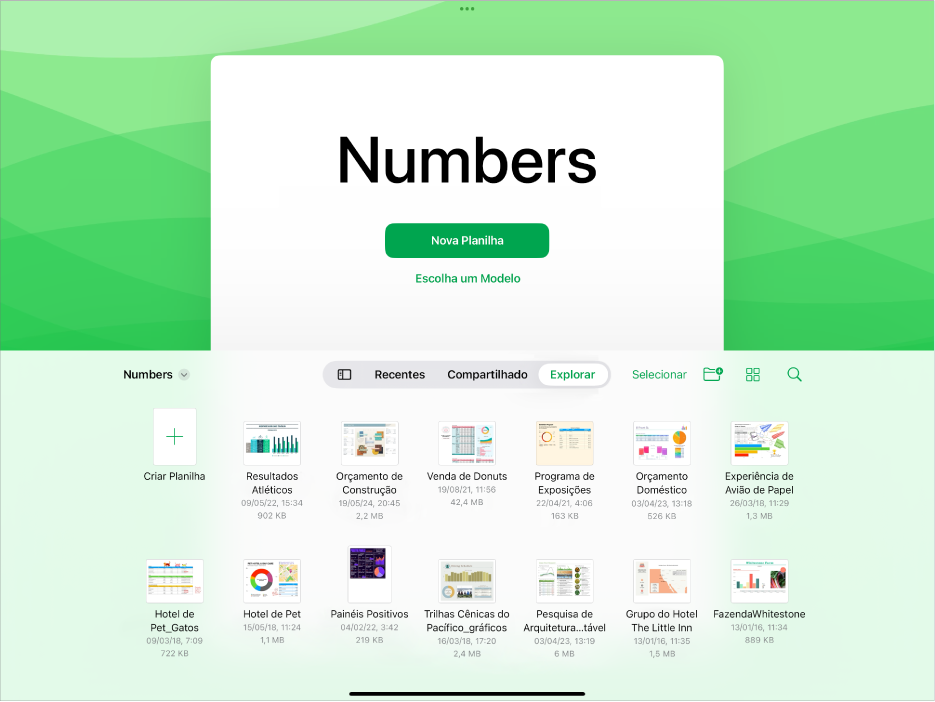 Gerencie as suas planilhas. Comece a usar rapidamente e mantenha a organização com o gerenciador de documentos atualizado. Vá diretamente a novas planilhas e modelos ou explore planilhas recentes, compartilhadas e salvas. Para ver o novo gerenciador de documentos, abra o Numbers no iPad.