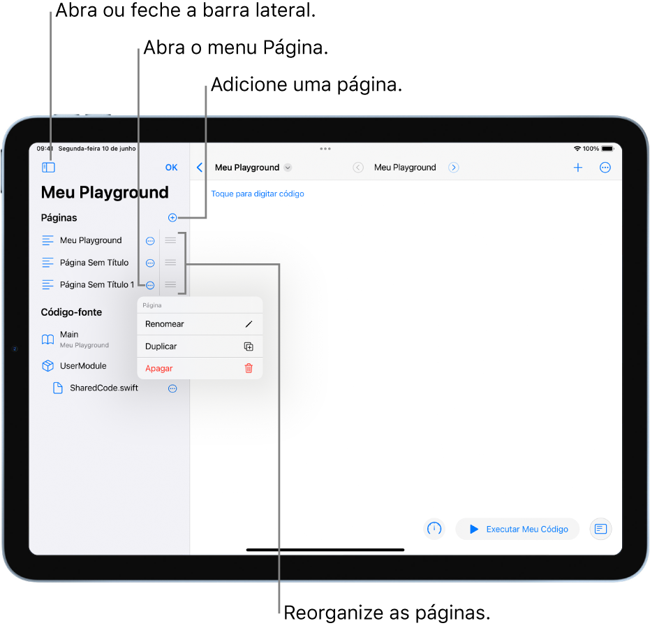 Você pode adicionar páginas ao livro de playground para acrescentar recursos e ajudar a organizar o código. Você também pode adicionar, renomear, reordenar, duplicar ou apagar páginas.