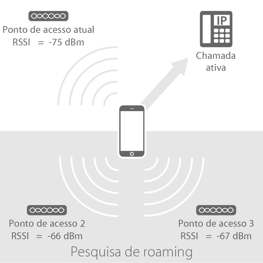 Se a chamada terminar e o dispositivo parar de enviar ou receber dados, o dispositivo procura os BSSID que têm um RSSI de, no mínimo, -63 dBm. Tenha em atenção que os quadros de gestão e controlo do 802.11 não são contabilizados como dados.
