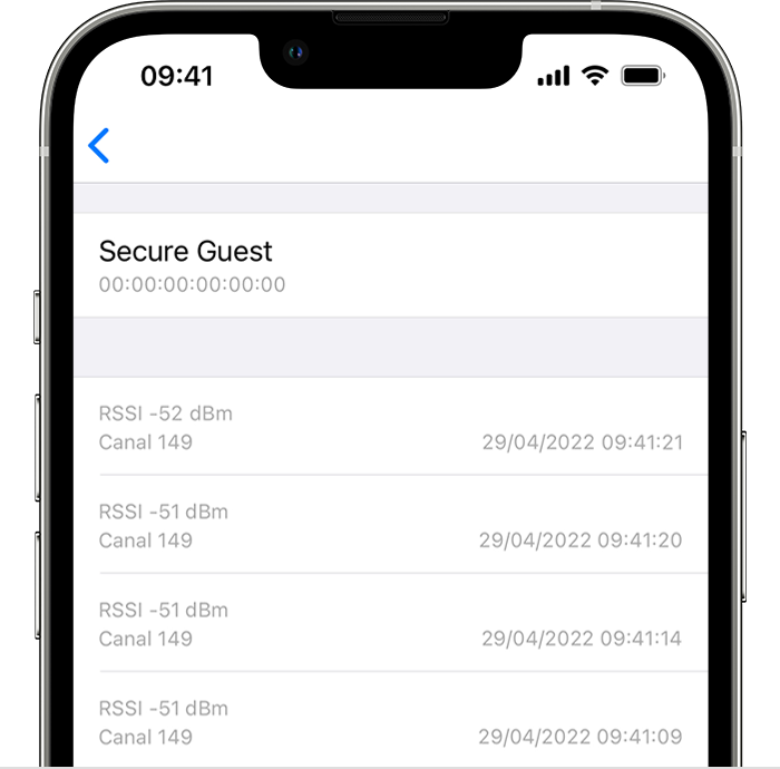 - Para visualizar um registo de rastreio dos resultados de pesquisa de SSID e BSSID, toque em SSID. O registo de rastreio apresenta a data juntamente com o canal e o RSSI.