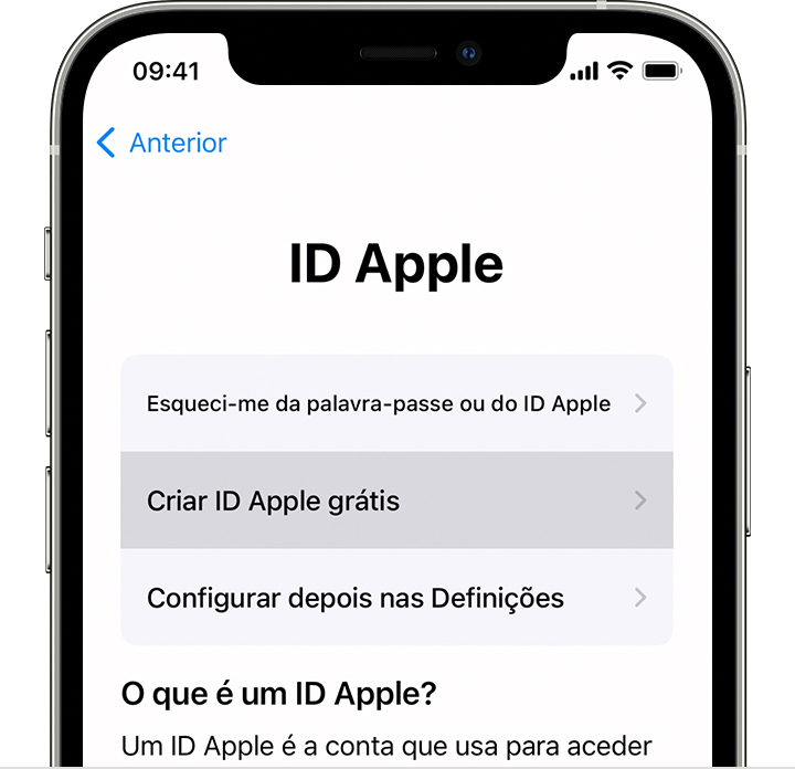 Pode criar um novo ID Apple ao configurar o dispositivo ou pode configurá-lo posteriormente na App Store.