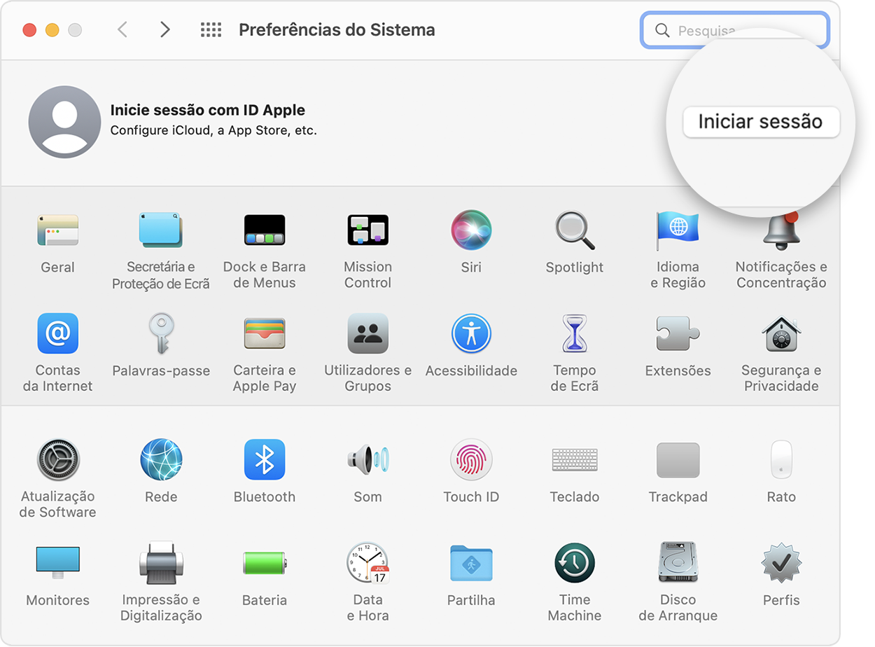 - Num Mac: selecione o menu Apple > Preferências do sistema e selecione ID Apple e inicie sessão com o seu ID Apple.