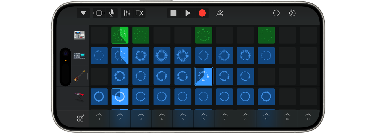 Utilize Live Loops para criar música eletrónica, tocando simplesmente nas células e colunas da quadrícula para iniciar loops musicais. Pode criar os seus próprios arranjos e, depois, improvisar e gravar uma atuação com Live Loops.