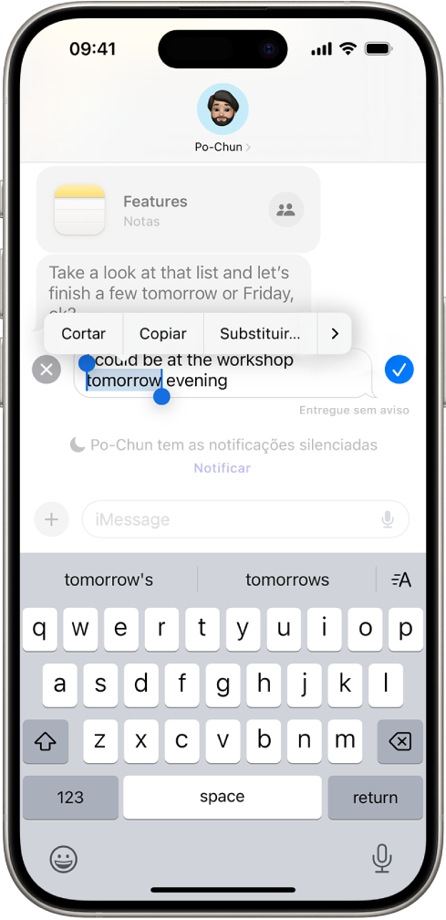 Nota: para anular o envio ou editar mensagens de texto, é necessário usar o iMessage com o iOS 16, iPadOS 16.1, macOS 13, visionOS 1 ou posterior. Se anular o envio de uma mensagem para uma pessoa que esteja a usar um sistema operativo anterior, a mensagem original permanece na conversa e recebe uma notificação que o destinatário ainda poderá ver a mensagem original. Se editar uma mensagem para um pessoa com um sistema operativo anterior, esta recebe as mensagens de seguimento com o prefácio “Editada para” e a nova mensagem entre aspas. As mensagens de texto SMS, MMS ou RCS não podem ser editadas nem o seu envio anulado. No entanto, as mensagens de texto SMS, MMS ou RCS podem ser editadas numa conversa de grupo, desde que pelo menos um outro utilizador do iMessage esteja no grupo.