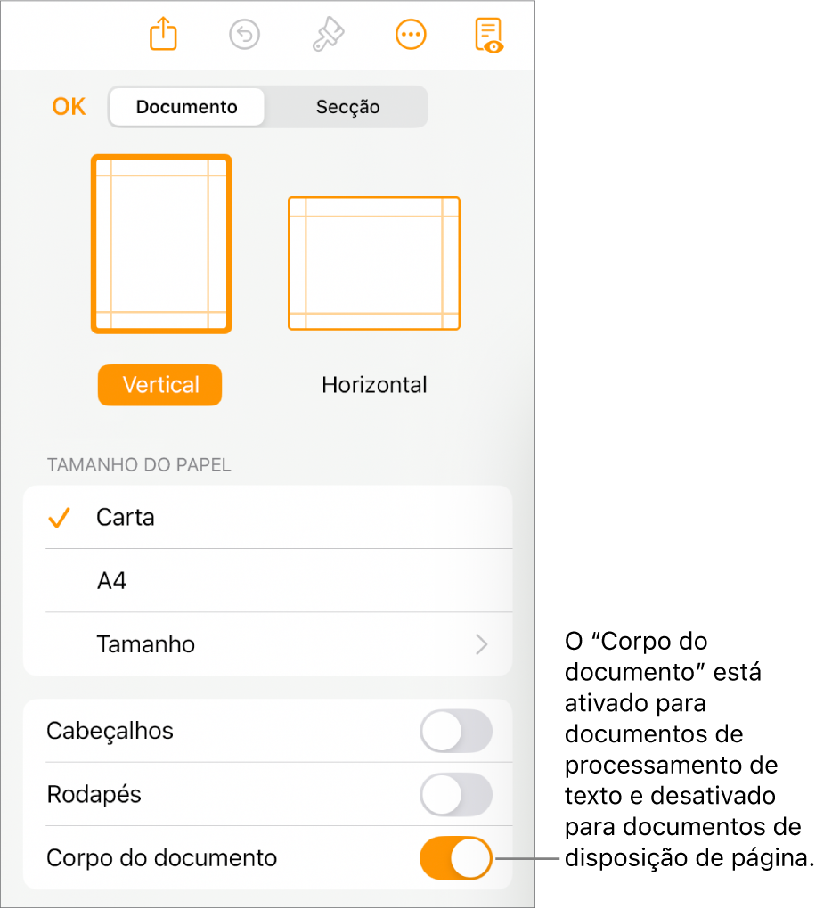, toque em “Opções do documento” e, em seguida, toque em “Configurar documento”. Se “Corpo do documento” estiver ativado, trata-se de um documento de processamento de texto; caso contrário, trata-se de um documento de disposição de página.