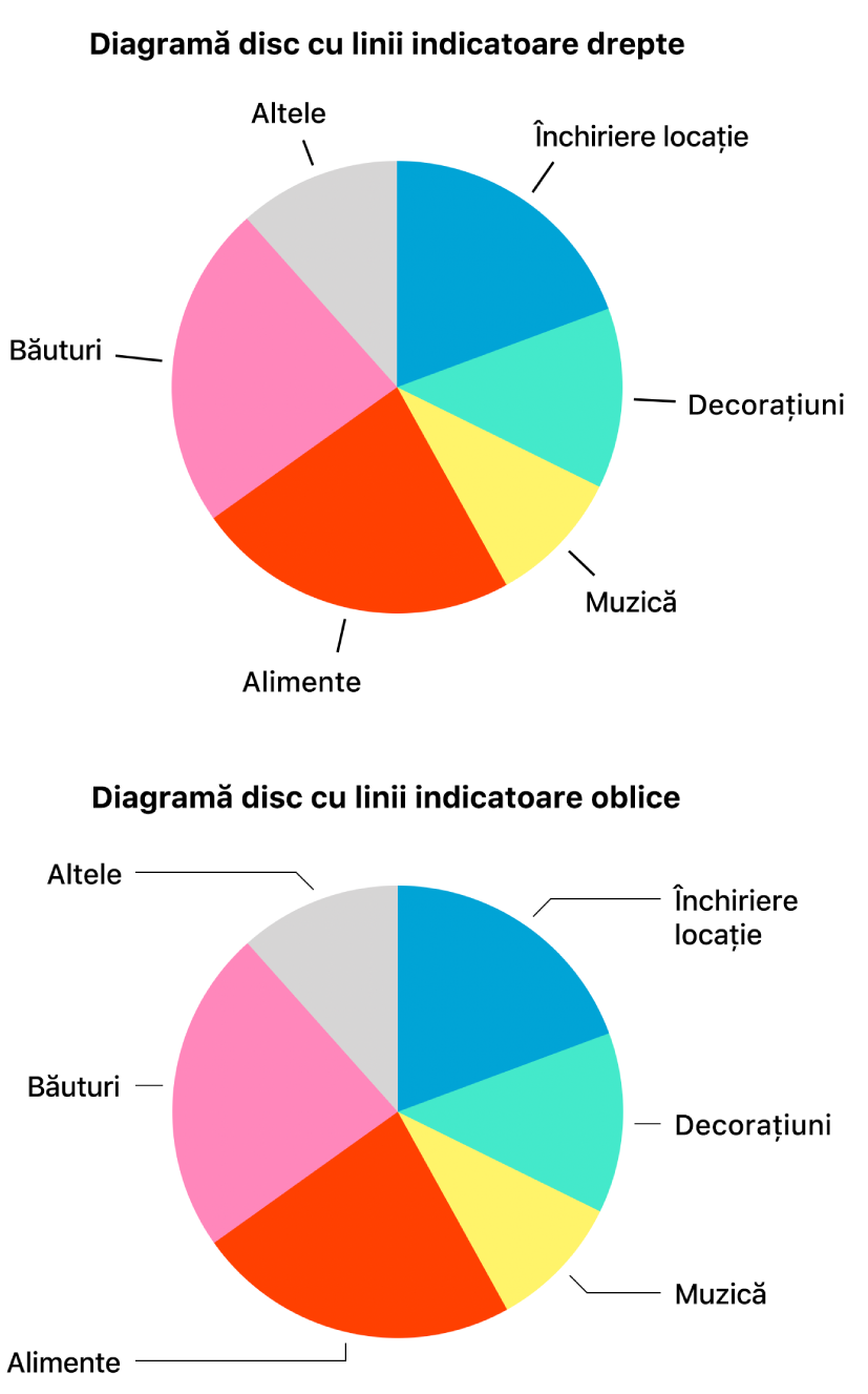 Dacă ați creat o diagramă disc sau inelară, puteți să poziționați etichetele de valoare și date și să adăugați linii indicatoare pentru a le conecta la sectoarele sau segmentele lor corespunzătoare. În fila Etichete, apăsați pe Poziție, apoi efectuați una dintre următoarele acțiuni: