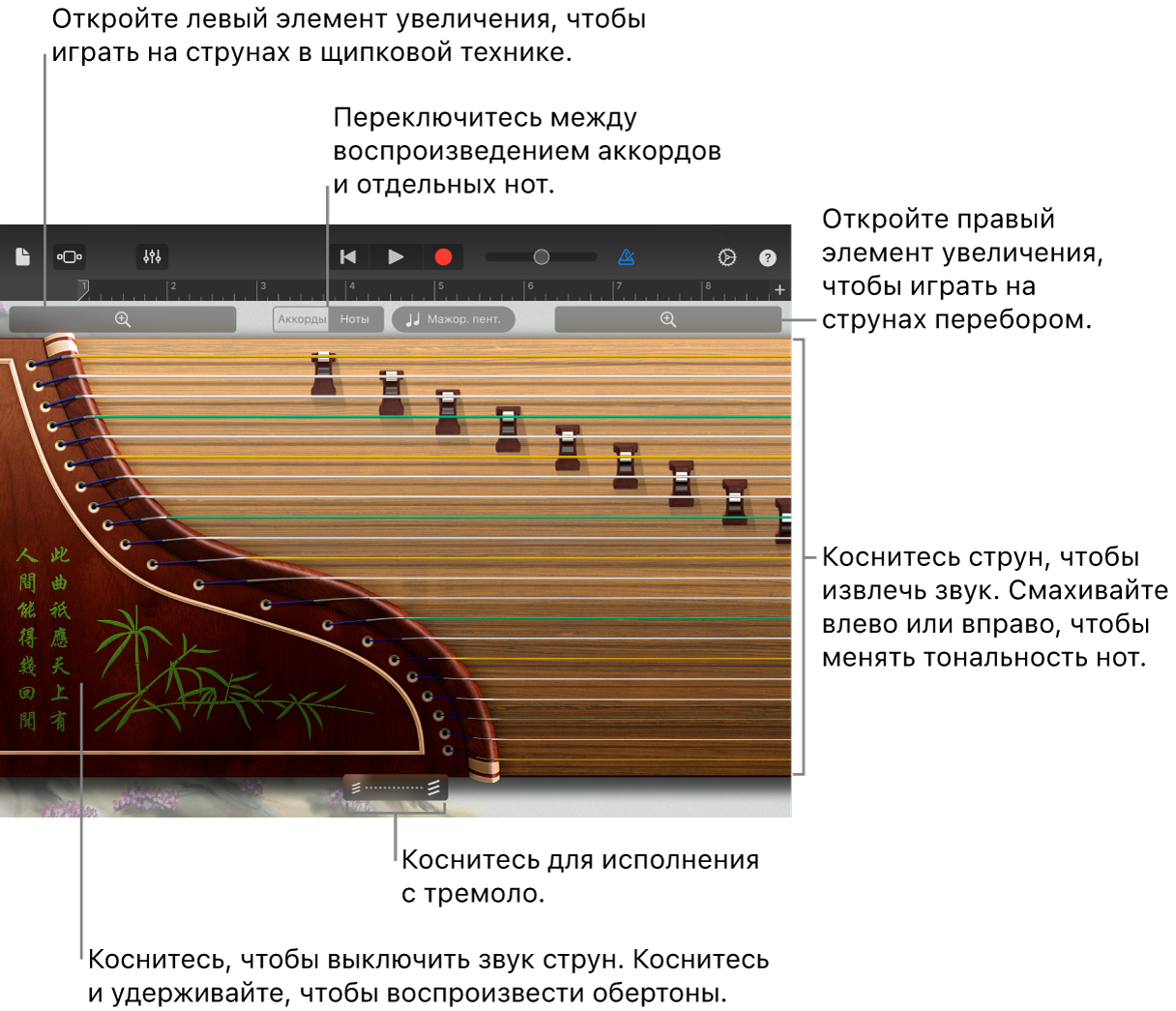 Воспроизведение обертонов. Коснитесь области гучжэна слева от струн и, удерживая ее, извлекайте ноты, касаясь струн или смахивая по ним.