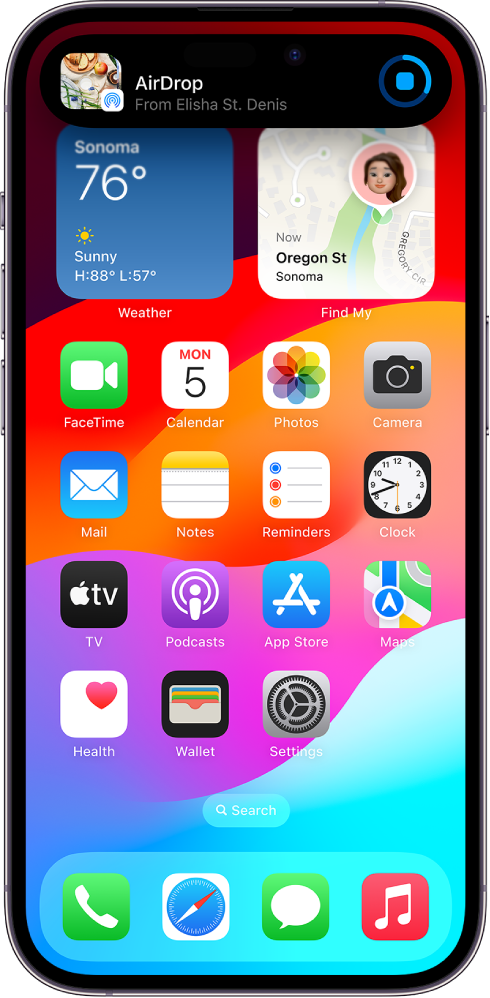 Экран блокировки. Часы динамически меняют свое положение в зависимости от фото или обоев на экране блокировки, чтобы не закрывать объект на изображении. При перемещении iPhone фото на экране блокировки оживает с использованием нового 3D‑эффекта. См. раздел Создание пользовательского экрана блокировки iPhone.