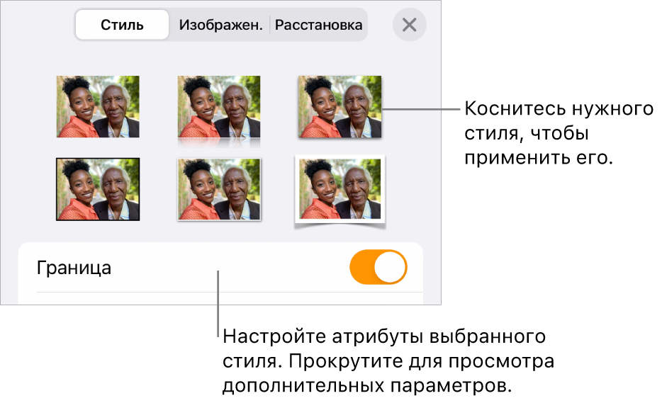 Чтобы отобразить элементы управления, позволяющие изменять внешний вид объектов, коснитесь