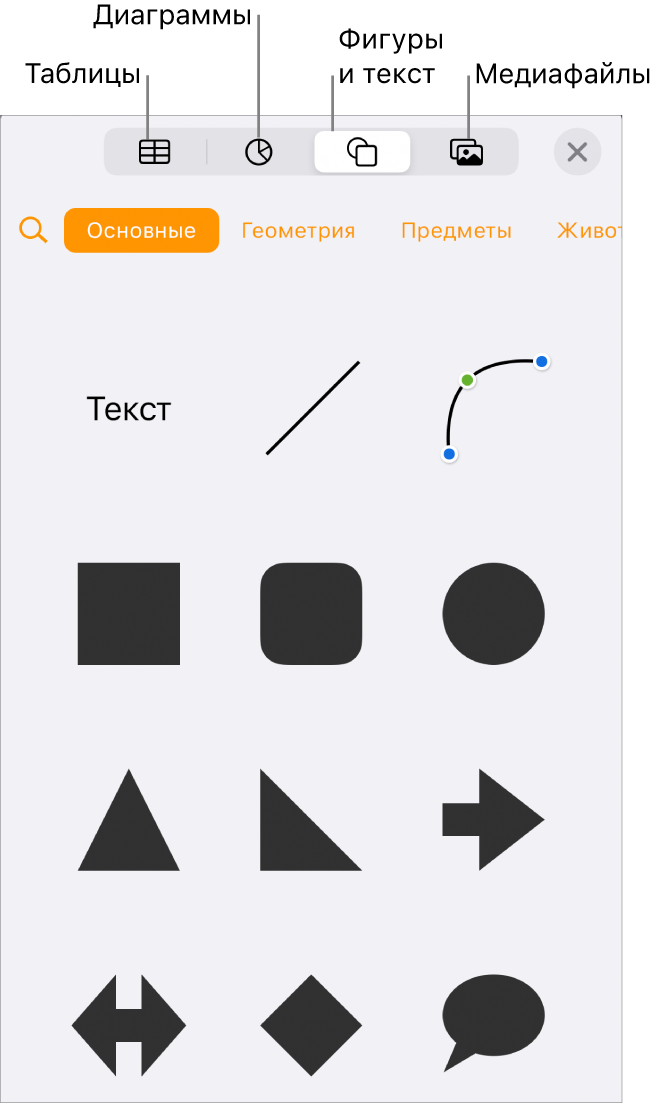 Объект — это любой элемент, который Вы размещаете на странице. Примеры объектов: таблицы, диаграммы, текстовые блоки, фигуры и фотографии. Чтобы добавить объект в документ, коснитесь кнопки