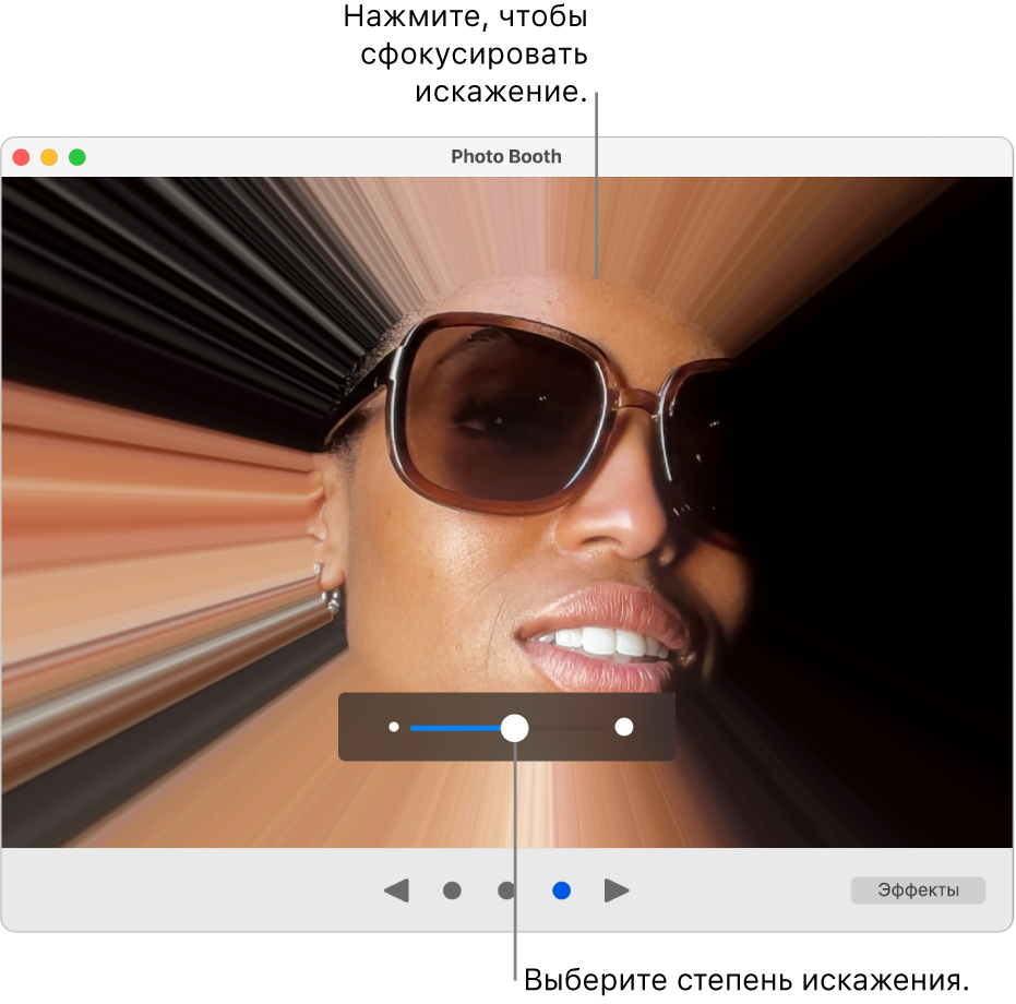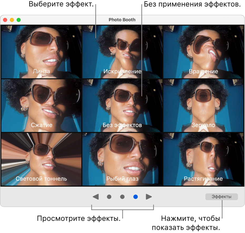 Примечание. В приложении Photo Booth также можно использовать различные видеоэффекты FaceTime. См. раздел Использование функций видеоконференции.