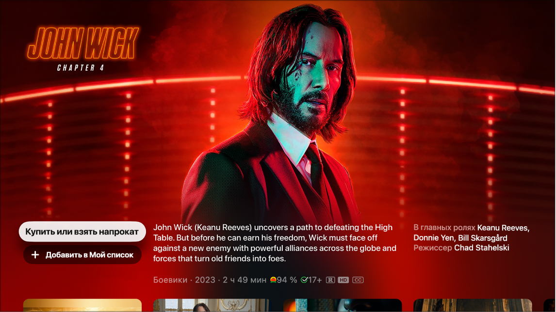 После того как Вы выберете фильм, откроется новый экран с рейтингами, описаниями и сведениями о просмотре, включая список всех способов посмотреть это фильм на Apple TV 4K.