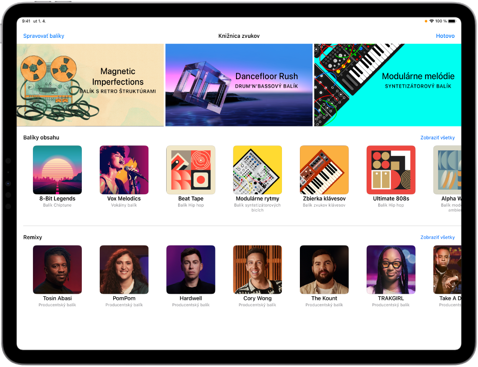 Pomocou Knižnice zvukov môžete sťahovať a spravovať zvukové balíky so stovkami slučiek, zvukov, dotykových nástrojov, zostavami bicích a ďalšími položkami. GarageBand vám bude oznamovať, keď budú na stiahnutie dostupné nové balíky zvukov.