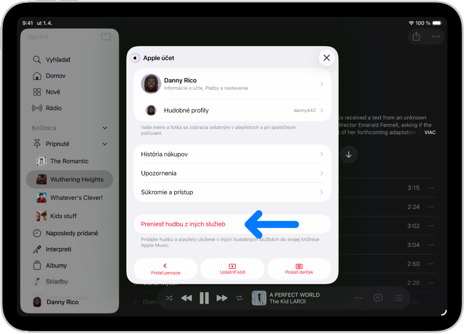 S predplatným môžete do Apple Music jednoducho preniesť hudbu z iných hudobných služieb. Klepnite na svoju profilovú ikonu v ľavom dolnom rohu postranného panela a potom klepnite na Preniesť hudbu z iných služieb. Podľa pokynov na obrazovke preneste svoju existujúcu knižnicu alebo playlisty.