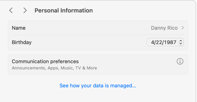 V nastaveniach Osobné informácie môžete zmeniť meno, dátum narodenia, informáciu o vekovej kategórii pre apky a nastavenia komunikácie spojené s vaším Apple účtom.