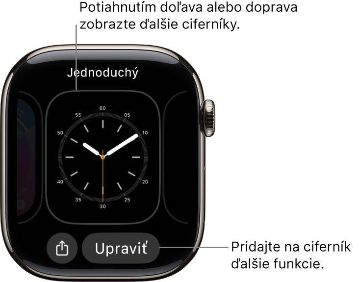 Tip: Potiahnutím tiež môžete prechádzať z jedného ciferníka na ďalší. Prejdite do apky Nastavenia na hodinkách Apple Watch, klepnite na Hodiny a potom zapnite možnosť Prepínať ciferník potiahnutím.